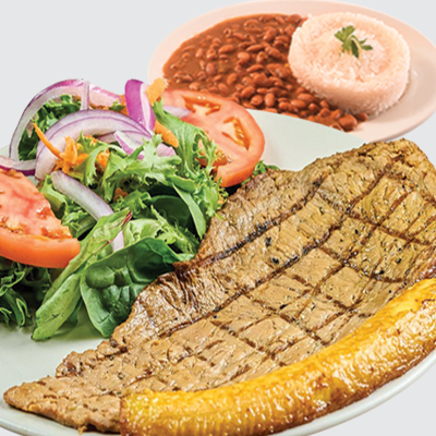 Skirt Steak With Onions: Rice, Beans, Salad And Green Plantain