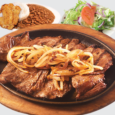 Arroz, Fríjoles, Chicharrón, Carne Asada, Huevo Y Maduro