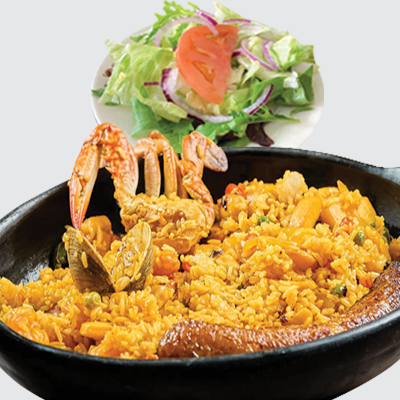 Seafood Paella: Combinations Of Seafood, Salad and Sweet Plantain